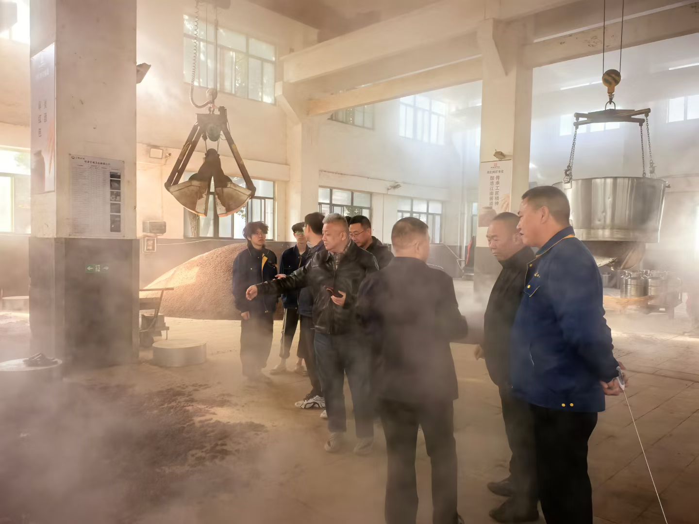 清晨的玉祁酒业酿造车间,蒸汽氤氲间弥漫着醇厚的粮香与曲香。王昭亮主任与徐岩教授团队直奔生产现场,沿着 “12987” 大曲坤沙工艺的关键环节,从酒醅摊凉、堆积发酵到入窖密封,逐一细致考察。作为坚守 “端午制曲、重阳下沙” 传统的江南酱酒,其一年生产周期、两次投料、九次蒸煮、八次发酵、七次取酒的复杂工艺,与王昭亮主任深耕的茅台核心工艺一脉相承。